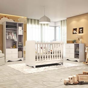 Quarto de Bebê Completo com Guarda Roupa Cômoda e Berço Americano 3 em 1 Pirueta Espresso Móveis Branco Brilho. Quarto Infantil com Guarda Roupas 3 Portas 2 Gavetas, Cômoda 1 Porta 3 Gavetas e Berço Mini Cama Mini Sofá Pirueta O momento da gravidez é muito especial, e montar o quartinho do bebê é uma tarefa realizada com muito amor, carinho e delicadeza. A linha Pirueta são produtos desenvolvidos em 100% MDF, acabamento em pintura UV, bordas laqueadas e pintura atóxica, um diferencial para oferecer maior segurança. O guarda roupas e a cômoda possuem corrediças telescópicas, que facilitam o deslize das gavetas, proporcionando maior durabilidade. Já o berço é certificado pelo INMETRO (004867/2020) e super versátil, podendo ser utilizado como Mini Cama e Mini Sofá, e acompanha suporte para mosqueteiro. Lindos e graciosos! É a composição perfeita para o seu bebê. Ean: 7909903058428