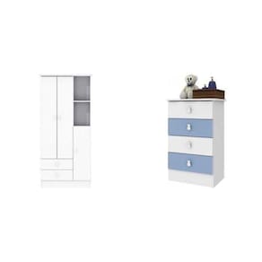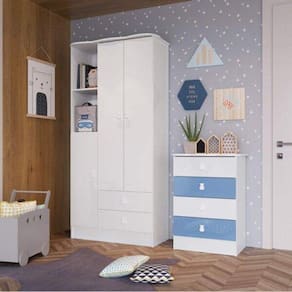 Quarto de Bebê Completo com Guarda-Roupa e Cômoda 376993 Espresso Móveis Branco/Azul. Guarda Roupa de Bebê 3 Portas 2 Gavetas em MDP BP branco 15 mm (nas laterais e prateleiras), acabamento laca nas portas e frentes de gaveta. Portas com dobradiças metálicas/Gavetas com corrediça telescópica. Ideal para uso em quarto infantil ou de bebê. Cômoda em MDP BP branco 15 mm (nas laterais e prateleiras), acabamento laca nas frentes de gaveta. Gavetas com corrediça telescópica. Puxador na cor branca. Utilizada em quarto de bebê ou infantil. Puxador em formato de urso. Ean: 7908161500342