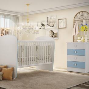 Quarto de Bebê Completo Cômoda 4 Gavetas com Berço Céu Móveis Percasa Branco/Azul. O Quarto de Bebê Completo Lua é composto por um Berço e uma comoda com quatro gavetas. As corrediças são telescópicas, proporcionando um melhor deslize das gavetas e o cabideiro é em aluminio. O berço acompanho kit de rodizios (sendo 2 com trava e 2 sem trava) Ean: 7909903123348