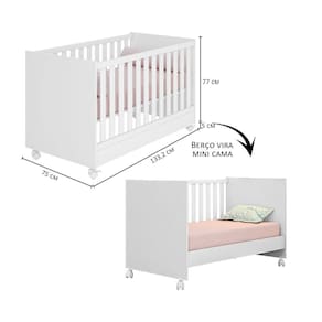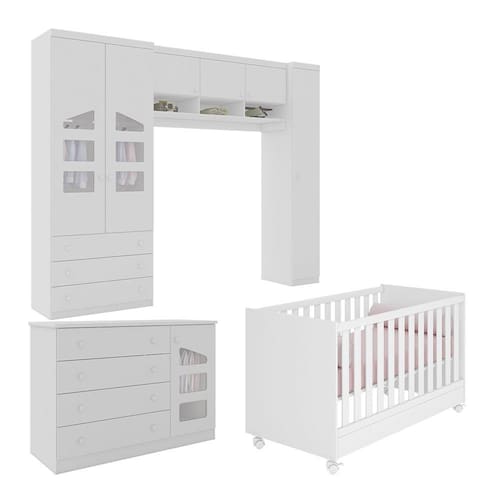 CaracterísticasEstrutura do berço em MDPPintura UVEstrado regulável em três alturasO berço transforma em mini camaAcompanha suporte para mosquiteiroAcompanha rodíziosEstrado em MDF. Grades fixasIndicado colchão de 130x70cm - atenção: não acompanha colchãoEstrutura demais itens em MDF07 Portas articuladasDobradiças metálicas07 Gavetas externasCorrediças metálicasDetalhe em acrílico nas portasCabideiro em alumínioPuxadores de plásticoPrateleiras com amplo espaço internoOBJETOS DECORATIVOS NÃO ACOMPANHAM O PRODUTO.Limpar o produto utilizando apenas pano umedecido com água, nunca utilizar produtos abrasivos ou esponjas de aço. Acompanha manual e todos os acessórios para montagem. Recomendamos que a montagem seja feita por um profissional qualificado. Garantia de 03 meses para eventuais defeitos de fabricação.Dimensões BerçoAltura 77 cmLargura: 133,2 cmProfundidade 75 cmDimensões Altura 225 cmLargura 289 cmProfundidade 47 cmItens Inclusos02 Guarda Roupas.01 Aéreo.01 Cômoda.01 BerçoPeso Total: 196 Kg09 volumesATENÇÃO, OBSERVAÇÃO IMPORTANTE.As imagens são meramente ilustrativas, não serão enviados objetos de decoração, eletrônicos e demais itens que não estejam especificados nos itens inclusos. é indispensável que seja feita a conferência do produto no ato da entrega e caso haja alguma divergência, seja feito o contato imediato com a loja e notificação no canhoto. constatando defeito no ato da entrega O produto não deverá ser montado até tratativa com a loja. Não será efetuada a troca do produto após a montagem ter sido efetuada. A montagem é de total responsabilidade do cliente e defeitos na montagem serão tratadas como assistências. Os processos de pendências serão tratados mediante a fotos para analise e conferência da informação. As cores do produto podem variar de acordo com o seu monitor, a iluminação do ambiente em que você está e até mesmo a sua percepção visual. Não nos responsabilizamos, no ato da entrega, por subir escadas e elevadores. Eventuais despesas são de responsabilidade do cliente. Dúvidas serão tratadas via protocolo.
