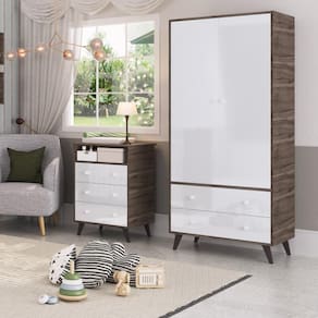 Quarto de Bebê Completo Guarda Roupa 2 Portas 2 Gavetas com Cômoda 3 Gavetas 1 Nicho Nuvem Móveis Percasa Carvalho/Branco. O Quarto de Bebê Retrô Nuvem é composto por um roupeiro de 2 portas e 2 gavetas, e uma comoda com 3 gavetas e um nicho na cor carvalho com branco. Os pés são em madeiras, e as corrediças são telescópicas. Pode ser utilizado em um quarto amplo, ou em um menor.