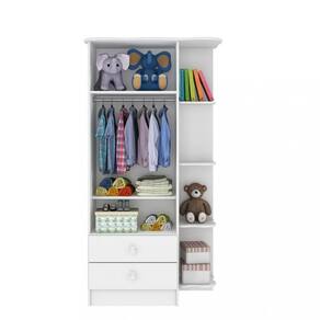 Características G Goupa: 1 Cabideiro 2 Gavetas 2 Portas 2 Prateleiras grandes sendo uma interna 4 Puxadores em formato de urso Acabamento semi-brilho Cantoneira com 4 prateleiras Corrediças telescópicas Dobradiças metálicas Estrutura em chapa de MDP 15mm