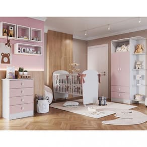 Quarto de Bebê Completo Guarda Roupa Cômoda e Berço com Rodízios Corujinha Percasa - Rosa