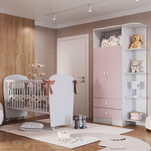 O Berço infantil da Móveis Percasa foi cuidadosamente projetado para garantir o conforto e a segurança do bebê. Estrutura em chapa de MDP de 15 mm, possui bordas de PVC arredondadas e estrado de chapa inteira para maior proteção do bebê. Certificado pelo Inmetro 003922/2018, o berço conta com acabamento em semi-brilho e grades de madeira revestidas com plástico. Acompanha suporte para mosquiteiro e kit de rodízios para facilitar a movimentação. Já o Guarda-roupa infantil, com estrutura em MDP de 15 mm, oferece resistência e durabilidade, além de gavetas com corrediças telescópicas e portas com dobradiças metálicas. O design charmoso, com puxadores em formato de urso, adiciona um toque de delicadeza ao quarto das crianças, tornando-o funcional e elegante.