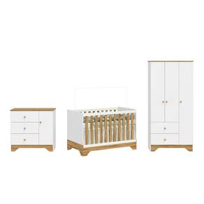 Informações Complementares: Estruturas em MDF 12mm, Fundo HDF 2,5mm, Tampo da Cômoda em MDF 15mm. Berço com estrado em laminado de madeira e MDF. Cabideiro metálico reforçado. Peso máximo por gaveta/prateleira: 5kg. Escala de brilho: Branco Brilhante e Amêndoa Semibrilho.