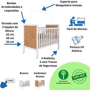 Possui a base do colchão com 03 opções de altura, acompanhando o crescimento do seu bebê. Conta ainda com 4 rodízios sendo 2 com trava de segurança. As grades são fabricadas em 25 e 12 mm, os quadros das cabeceiras também em chapa de 25 mm. Possui Bordas arredondadas e laqueadas, proporcionando maior segurança e uma sensação agradável ao toque.