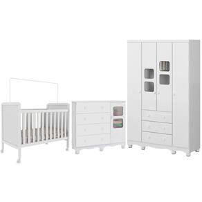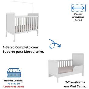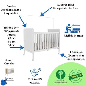 O Quarto de Bebê Completo Guarda Roupa Uli 4 Portas 3 Gavetas Berço Mini Cama Cloe Padrão Americano e Cômoda Uli 4 Gavetas 1 Porta da Móveis Peroba, são perfeitos para você que busca Organização, Versatilidade, Durabilidade e Segurança. Espaçoso para acomodar todos os itens do seu Bebê, versátil podendo ser utilizado como Mini Cama, tendo um visual encantador e decorando o quarto do seu Bebê.O Berço Cloe, padrão americano é um produto feito com muito carinho para compor o quarto do seu bebê. Produzido com material 100% MDF, vem com varal para mosquiteiro incluso e a sua pintura é atóxica, um cuidado extra para segurança do seu bebê. Possui a base do colchão com 03 opções de altura, acompanhando o crescimento do seu bebê. Conta ainda com 4 rodízios sendo 2 com trava de segurança. As grades são fabricadas em 25 e 12 mm, os quadros das cabeceiras também em chapa de 25 mm. Possui Bordas arredondadas e laqueadas, proporcionando maior segurança e uma sensação agradável ao toque. O berço Cloe é um produto versátil, 2 em 1, que vira Minicama. Berço está disponível nas cores: Branco Brilho / Branco Brilho com Carvalho.Todos os berços da Móveis Peroba são certificados pelo INMETRO. Um requisito fundamental para a sua segurança e a do seu bebê!O Guarda Roupa e Cômoda Uli são Produtos 100% MDF, pintura é atóxica, possuem cabideiro metálico, puxadores plásticos, corrediças metálicas, pés em ABS e ainda 02 modelos de rodapé inclusos o reto e o ondulado. As portas têm acabamento com PETG cristal.Informaçoes Técnicas:-Berço CloeDimensões do berço montado: Altura 111,5 cm x Largura 135 cm x Profundidade: 78,2 cmDimensões para o colchão: Comprimento: 130 cm x Altura 12 cm (Máximo permitido) x Largura 70 cm-Cômoda Infantil UliAltura: 88 cmLargura: 95,3 cmProfundidade: 42 cmQuantidade de Gavetas: 04 Gavetas (Peso suportado 4Kg)Quantidade de Portas: 01 PortaMaterial: 100% MDFCores Disponíveis: Branco Brilho / Branco Brilho com CarvalhoAcabamento do Produto: Pintura UV Atóxica/ Pintura PU e Fita de BordoAcabamento das Portas: PETG Cristal (Acrílico transparente)Tipo de Corrediça: Corrediça MetálicaTipo de Cabideiro: Cabideiro MetálicoTipo de Puxadores: PlásticosTipo de Pés: Plásticos (Altura 6cm)Rodapé: 1 Reto e 1 Ondulado (Cliente escolhe na montagem)-Guarda Roupa Infantil UliAltura: 188,5 cmLargura: 121,1 cmProfundidade: 41,5 cmQuantidade de Gavetas: 03 Gavetas (Peso suportado 4Kg)Quantidade de Portas: 04 PortasMaterial: 100% MDFCores Disponíveis: Branco Brilho / Branco Brilho com CarvalhoAcabamento do Produto: Pintura UV Atóxica/ Pintura PU e Fita de BordoAcabamento das Portas: PETG Cristal (Acrílico transparente)Tipo de Corrediça: Corrediça MetálicaTipo de Cabideiro: Cabideiro MetálicoTipo de Puxadores: PlásticosTipo de Pés: Plásticos (Altura 6cm)Rodapé: 1 Reto e 1 Ondulado (Cliente escolhe na montagem)Embalagem: Peças envoltas em isomanta, caixa de papelão revestidas com plástico termoencolhívelManual de Montagem: Manual segue na embalagem do produtoRecomendações de Uso, Manutenção e Limpeza:Para limpeza utilize somente pano limpo e macio, ligeiramente umedecido em água (apenas o bastante para remover a poeira), seguido de um pano seco. Perguntas Frequentes:A - É fácil montar o Berço Cloe, Guarda Roupa Infantil e Cômoda Infantil Uli da Móveis Peroba?Nível de complexidade alta, sugerimos a contratação de um montador especializado. Nós não realizamos a montagem dos produtos e não oferecemos esse serviço.B - Tenho a opção de comprar Berço Cloe, Guarda Roupa Infantil ou Cômoda Infantil Uli separado?Sim, só buscar aqui no site que vai encontrar nossa oferta.C - Qual a configuração do Guarda Roupa Infantil e Cômoda Infantil Uli da Móveis Peroba?É uma Cômoda infantil Uli com 4 gavetas e 1 porta.Guarda Roupa Infantil Uli com 3 gavetas e 4 portas.D - Como organizar a Cômoda infantil Uli?Você vai naturalmente encontrar a melhor maneira de organizar sua cômoda.Entretanto, vale a pena pontuar algumas situações:1-A cômoda deve estar sempre limpa*;2-O Trocador (caso você tenha) pode ocupar bastante espaço no tampo da cômoda;3-Primeira Gaveta: Utilize para os produtos de Higiene do bebê;4-Demais Gavetas: Utilize para roupas e acessórios do bebê.E - Quais as cores disponíveis para o Berço Cloe, Guarda Roupa Infantil e Cômoda Infantil Uli da Móveis Peroba?Temos nas cores Branco Brilho / Branco Brilho com Carvalho. F - Onde são fabricados o Berço Cloe, Guarda Roupa Infantil e Cômoda Infantil Uli?O Berço Cloe, Guarda Roupa Infantil e Cômoda Infantil Uli sâo fabricados na cidade de Linhares-ES, pela Peroba Móveis Infantis.A Peroba é atualmente uma das maiores fábricas de Móveis Infantis da América Latina.