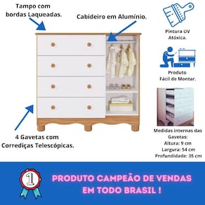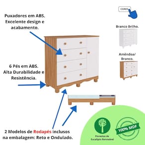-Cômoda Infantil Junior Altura: 88 cm Largura: 95,3 cm Profundidade: 42 cm Quantidade de Gavetas: 04 Gavetas ( Peso suportado 4Kg) Quantidade de Portas: 01 Porta Material: 100% MDF Cores disponíveis: Branco Brilho, Amêndoa/Branco. Acabamento do Produto: Pintura UV Atóxica/ Pintura PU e Fita de Bordo Tipo de Corrediça: Corrediça Telescópica Tipo de Cabideiro: Cabideiro Metálico Tipo de Puxadores: Plásticos Tipo de Pés: Plásticos ( Altura 6cm)