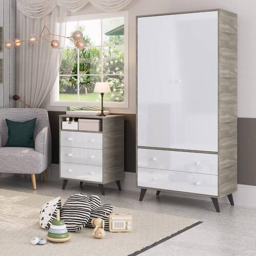 Quarto de Bebê Completo Roupeiro 2 Portas 2 Gavetas com Cômoda 3 Gavetas 1 Nicho Nuvem Móveis Percasa Fresno/Branco. O Quarto de Bebê Retrô Nuvem é composto por um roupeiro de 2 portas e 2 gavetas, e uma comoda com 3 gavetas e um nicho na cor fresno com branco. Os pés são em madeiras, e as corrediças são telescópicas. Pode ser utilizado em um quarto amplo, ou em um menor.