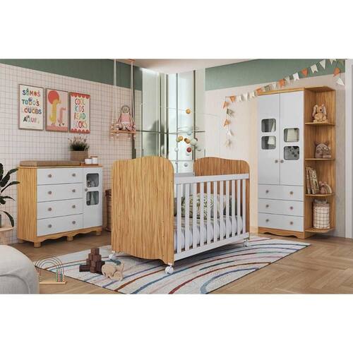 Quarto Infantil Completo Uli 3 Peças (1GuardaRoupa+1Berço+1Cômoda) QI108 Branco/Amendoa - Peroba
