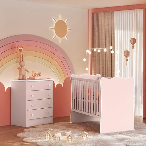 Características Estrutura em MDP Acabamento em pintura UV Acetinada Atóxica Grades de proteção fixas feitas em MDF Estrado em MDF com 3 opções de altura Acompanha suporte para mosquiteiro Colchão não está Incluso - Ideal para colchão de 130 x 60 cm Suporta até 40 kg. 04 Gavetas externas Gavetas com corrediças metálicas Puxadores duplos em plástico poliestireno com formato de estrela Acabamento das bordas em perfil PVC Sistema anti-tombamento para evitar riscos de acidentes.