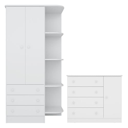 Características Estrutura em MDP Acabamento em Pintura UV Atóxica 03 Portas articuladas 07 Gavetas externas Roupeiro com cantoneiras laterais acopladas Amplo espaço interno com prateleiras Cabideiro oblongo metálico Dobradiças e corrediças metálicas Puxadores em plástico poliestireno com formato de estrela Acabamento das bordas em perfil PVC Sistema anti-tombamento para evitar riscos de acidentes.