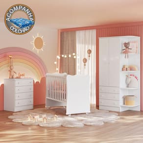 Características Estrutura em MDP Acabamento em pintura UV Atóxica Grades de proteção fixas feitas em MDF Estrado em MDF com 3 opções de altura Acabamento das bordas em perfil PVC Acompanha suporte para mosquiteiro Acompanha kit de rodízios ACOMPANHA COLCHÃO 130 X 60 Suporta até 40 kg. 02 Portas articuladas 07 Gavetas externas Roupeiro com cantoneiras laterais acopladas Amplo espaço interno com prateleiras Cabideiro oblongo metálico Dobradiças e corrediças metálicas Puxadores em plástico poliestireno com formato de estrela Sistema anti-tombamento para evitar riscos de acidentes.
