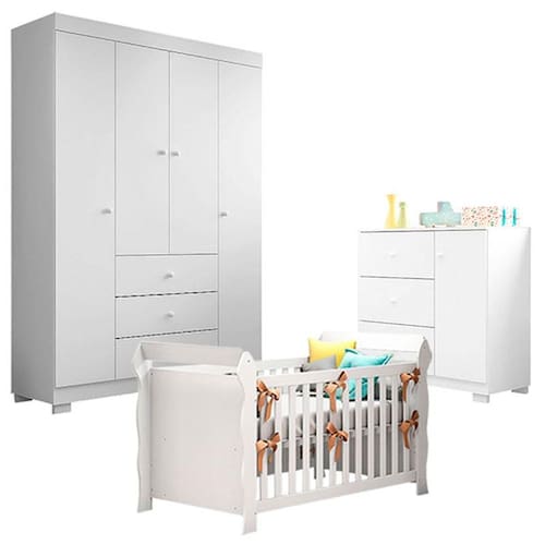 Começou a montar o quartinho do seu bebê? Então apresentamos para você este belo conjunto composto pelo berço americano da linha Lara fabricado pela Carolina, cômoda e guarda roupa 4 portas da linha Duda fabricado pela Phoenix Baby. O berço pode ser utilizado como mini cama, conforme seu bebê vai crescendo, prolongando sua vida útil. A cômoda possui três gavetas e uma porta. Completando o conjunto, o guarda roupa conta com quatro portas e três gavetas. Com amplo espaço interno traz mais praticidade para a mamãe acomodar as roupinhas e acessórios. Desenvolvidos em MDP/ MDF de alta qualidade, garante mais durabilidade e resistência. Esse conjunto traz sofisticação para seu ambiente. Além disso, foi cuidadosamente projetado para acompanhar todas as fases de crescimento do seu filho. Confira as características: