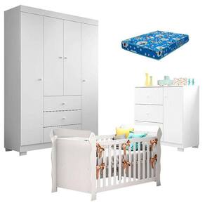 Quarto de Bebê Duda 4 Portas e Berço Americano Lara Branco Brilho com Colchão Ortobom Phoenix Baby