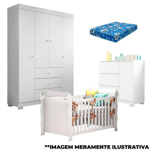 Quarto de Bebê Duda 4 Portas e Berço Americano Lara Branco Brilho com Colchão – Phoenix Baby