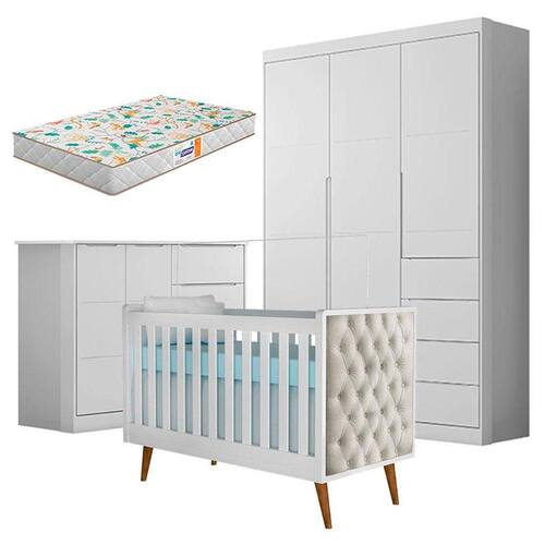 Quarto de Bebê Eloá com Berço Americano Lorena Branco Acetinado com Capitonê Bege e Colchão Gazin Phoenix Baby