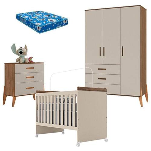 A mamãe começou a montar o quartinho do seu filho? Apresentamos para você este belo conjunto composto pelo berço mini cama da linha Lívia acompanhado do colchão Ortobom, cômoda gaveteiro e guarda roupa 3 portas da linha Emilly. Com o berço se transformando em mini cama, prolongando a sua vida útil, a cômoda possuindo três gavetas e o guarda roupa tendo três portas e três gavetas proporcionam para a mamãe um ótimo espaço interno para acomodar as roupinhas e acessórios. Fabricados pela Canaã, são desenvolvidos em 100% MDF de qualidade, garantindo mais durabilidade e resistência. Sendo o conjunto perfeito para combinar com qualquer ambiente, além disso, foi projetado para acompanhar todas as fases de crescimento do seu filho. Confira as características: