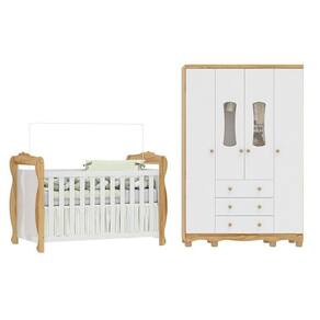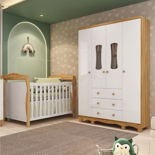 Quarto de Bebê Guarda-roupa 4 Portas com Janelas e Berço Minicama 100% Mdf Aurora Espresso Móveis Branco Brilho/Amêndoa