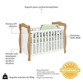 Produtos estrurados em 100% MDF e com acabamento em pintura UV atóxica. O berço possui padrão de colchão americano, estrado com altura regulável e todas as bordas arredondadas e laqueadas, que proporcionam uma sensação agradável ao toque, além de poder ser utilizado como minicama ou minisofá, prolongando seu uso.