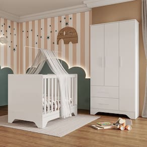 Caracter?sticas do Guarda Roupa: Estrutura 100 MDF Acabamento pintura UV at?xica 3 Portas 2 Gavetas Caracter?sticas do Ber?o: Estrutura: 100 MDF Acabamento: Pintura UV At?xica Espessuras: Estrutura 12mm, Barra das Grades 25mm Tipo de Estrado: Regul?vel em 2 posi??es -22 e 54 - cm- Op??es de montagem: Pode montar como ber?o, minicama ou minissof? Tamanho do Colch?o Indicado -LxC - cm-: 70 x 130 -Infantil Americano- Certificado INMETRO: Ber?o Popy Retr? 008091/2021 Suporta at?: 40kg