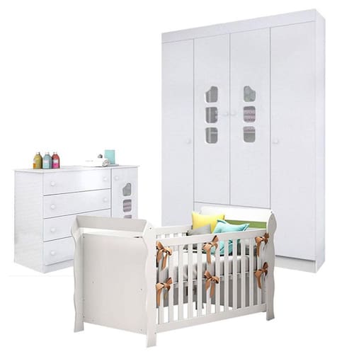 Chegou a hora de escolher os móveis para o quartinho do bebê, pensando nisso apresentamos Quarto de Bebê Lívia composto por Guarda Roupa 4 Portas e Cômoda com Porta desenvolvidos pela Phoenix , com lindo design para proporcionar modernidade ao ambiente e a praticidade que você precisa na hora de organizar as roupas e acessórios do bebê e o Berço Lara fabricado pela Carolina Baby oferecendo o conforto na hora do sono. Aproveite!