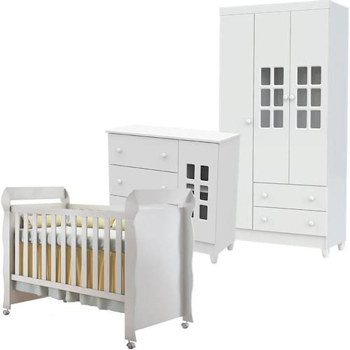 Quarto de Bebê Mariah 3P com Berço Mirelle Branco Brilho - Carolina