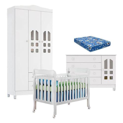 Quarto de Bebê New Selena 3 Portas com Berço Lila e Cômoda Gran Selena Branco Brilho e Colchão Ortobom Carolina Móveis