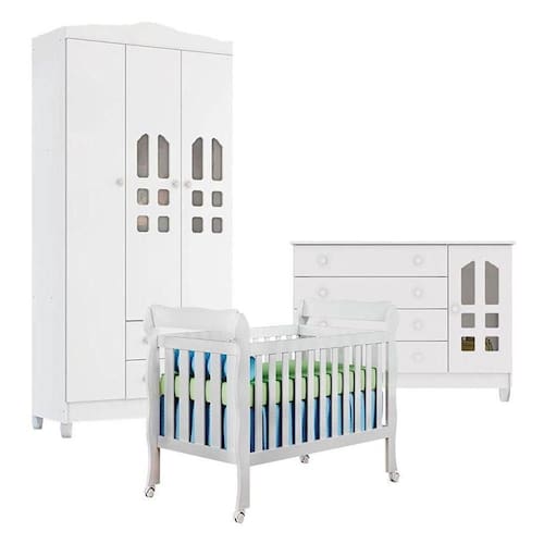 Quarto de Bebê New Selena 3 Portas com Berço Lila e Cômoda Gran Selena Branco Brilho Carolina Móveis