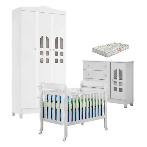 Quarto de Bebê New Selena 3 Portas com Berço Lila e Cômoda Selena Branco Brilho e Colchão Gazin Carolina Móveis
