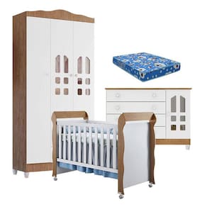 Quarto de Bebê New Selena 3 Portas com Cômoda Gran Selena e Berço Mirelle Branco Acetinado Amadeirado e Colchão Ortobom – Carolina Móveis