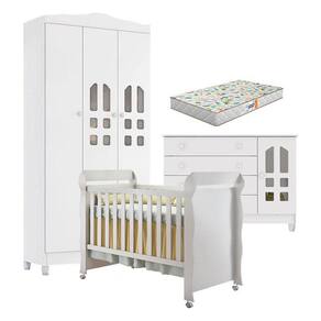 Quarto de Bebê New Selena 3 Portas com Cômoda Gran Selena e Berço Mirelle Branco Brilho e Colchão Gazin – Carolina Móveis