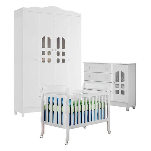 Quarto de Bebê New Selena 4 Portas com Berço Lila e Cômoda Selena Branco Brilho – Carolina Móveis