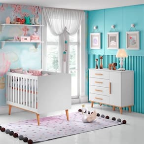 Móveis que trazem mais harmonia para o dormitório do seu bebê. No estilo retrô, a cômoda e o berço 3 em 1 têm os pés palitos de madeira maciça, testados em laboratório para garantir total segurança e resistência às peças. Estes produtos se encontram disponíveis nas cores Branco Fosco com Bétula, Cinza Fosco e Rosa Fosco.
