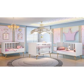 Um dormitório no estilo retrô para deixar o ambiente ainda mais encantador. Produzidos em MDP e MDF de alta resistência mecânica e os pés palitos de madeira maciça, esses móveis são todos rigidamente testados em laboratório e certificados pelo INMETRO. O berço multifuncional também serve como mini-cama e mini-sofá, o guarda-roupa e a cômoda contam com corrediças telescópicas em suas gavetas, trazendo mais segurança e leveza às peças. Disponíveis nas cores Branco Fosco, Cinza Fosco e Rosa Fosco.