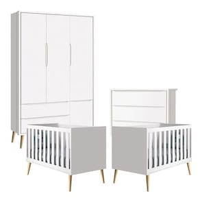 Quarto de Bebê Theo 3 Portas com 02 Berços e Cômoda Gaveteiro Branco Acetinado Pés Madeira Natural - Reller