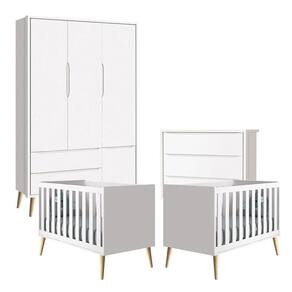Quarto de Bebê Theo 3 Portas com 02 Berços e Cômoda Gaveteiro Branco Acetinado Pés Madeira Natural - Reller