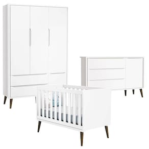 O quarto de bebê que você procura com qualidade e bom preço você encontra aqui! Apresentamos mais essa linda opção de Quarto de Bebê Theo com Guarda Roupa Infantil 3 Portas, Cômoda Infantil com Porta e Berço Branco Acetinado da Reller, móveis com estilo retro com amplo espaço e ótima repartição interna, possui tudo o que você precisa para deixar as roupas e acessórios do bebê sempre bem organizados com total conforto e praticidade no seu dia a dia, confira!