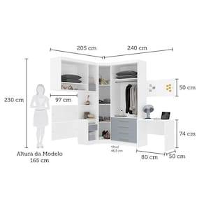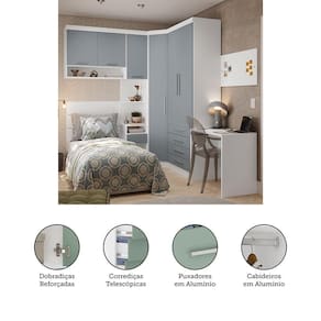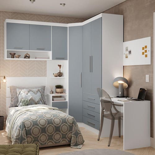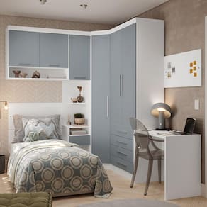 Ambiente composto por: ? 1 Mesa de Cabeceira Alta 38cm 1 Porta e 1 Gaveta Alpes Luciane Móveis 230 x 38 x 41,5 -Alt x Larg x Prof - cm- ? 1 Painel Cabeceira Solteiro 97cm Uni Alpes Paris Luciane Móveis 90 x 97 x 1,5 -Alt x Larg x Prof - cm- ? 1 Armário Aéreo Maleiro Modulado 97cm 2 Portas Alpes Luciane Móveis 82 x 97 x 41,5 -Alt x Larg x Prof - cm- ? 1 Guarda Roupa de Canto Diagonal Modulado 70cm 1 Porta Alpes Luciane Móveis 230 x 70 x 70 -Alt x Larg x Prof - cm- ? 1 Guarda Roupa Modulado 90cm 2 Portas e 4 Gavetas Alpes Luciane Móveis 230 x 90 x 46,5 -Alt x Larg x Prof - cm- ? 1 Escrivaninha Multiuso Compacta com Painel 80cm Prime Luciane Móveis Escrivaninha: 74 x 80 x 50 e Painel: 50 x 80 x 1,5 -Alt x Larg x Prof - cm-