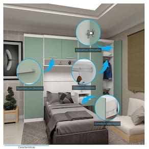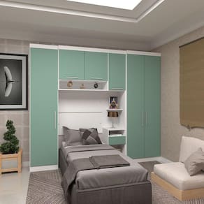 Quarto De Solteiro Com Guarda Roupas E Mesa De Cabeceira Alpes Luciane Móveis Branco Pf Com Verde Pf A linha de modulados Alpes oferece diversas solucoes para o seu projeto, com design clean proporciona ao seu quarto ficar moderno e elegante. Os modulos sao multifuncionais e podem ser montados conforme a sua disponibilidade de espaco. Caracteristicas: Estrutura: 100 MDP Acabamento: PF Quantidade de Portas: 6 Tipo de Abertura das Portas: de Bater Quantidade de Gavetas: 1 Tipo de Corredicas: Telescopicas Tipo de Cabideiros: 2 em Aluminio Tipo de Puxador: Aluminio Prata Tipo de Pes: Rodape Sistema de Montagem: Cavilhas, Parafusos e Minifix Garantia: 3 meses