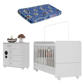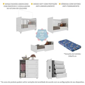 O Quarto Infantil Berço com Colchão Incluso e Cômoda Pimpolho Multimóveis é produzido em MDP/MDF, que garante maior durabilidade, facilidade na limpeza e possui acabamento acetinado (cerca de 20% de brilho). O berço 3 em 1 (se transforma em sofá e minicama), é padrão americano (tamanho do colchão 1,30 x 0,70), com rodízios (2 com trava de segurança) que facilitam a movimentação na hora da limpeza, possui 3 regulagens de altura para o colchão e acompanha suporte para mosquiteiro, que garante noites mais tranquilas de sono para o bebê. A grade Soft (PVC) é produzida de maneira ecologicamente correta, com matéria-prima livre de metais pesados, atóxica e com proteção antiamarelamento. A cômoda possui 1 porta (com prateleira e cabideiro em alumínio) e 4 gavetas espaçosas para organizar todos os pertences do bebê. A porta com detalhes em vidro incolor dá um toque descontraído ao ambiente. Para maior segurança, a cômoda acompanha kit com sistema antitombamento, que contribui para evitar acidentes. O colchão, densidade D18, que acompanha o dormitório, possui tratamento antiácaro, antialérgico e antimofo e é indicado para crianças de até 3 anos. Berço Certificado pelo INMETRO sob o Selo n 005911/2017.
