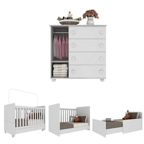 Transforme o quarto do seu bebê em um ambiente acolhedor e funcional com o Quarto Infantil Pimpolho Multimóveis. Produzido em MDP/MDF com acabamento acetinado, proporcionando cerca de 20% de brilho, este conjunto é perfeito para quem busca qualidade e sofisticação. A cômoda possui 1 porta com prateleira e cabideiro, além de 4 gavetas espaçosas para guardar as roupinhas do seu pequeno. Com detalhes em vidro incolor na porta, ela ainda traz um toque elegante ao ambiente. E não se preocupe quanto à segurança: a cômoda acompanha kit com sistema antitombamento. O Berço Americano 3 em 1 é perfeito para garantir o conforto e a segurança do seu bebê. Certificado pelo INMETRO, é produzido em MDP com acabamento em pintura UV e Laca PU que garantem durabilidade e resistência. O diferencial deste produto está na sua versatilidade: além de ser um berço padrão americano (tamanho do colchão 130 x 70cm) superconfortável, ele também se transforma em sofá e minicama, acompanhando o crescimento da criança. Pensando no bem-estar do seu pequeno, este berço possui grade Soft (PVC) ecologicamente correta, elaborada com matéria-prima livre de metais pesados, atóxica e com proteção anti-amarelamento. Além disso, conta com suporte para mosquiteiro que protege o bebê dos insetos indesejáveis durante as noites de sono. O colchão D18 incluso oferece tratamento anti-ácaro e anti-alérgico para maior tranquilidade dos pais. Com lastro do colchão ajustável em 5 diferentes alturas, você pode regular conforme a necessidade do momento ou fase da criança. E não podemos esquecer dos práticos rodízios que facilitam a movimentação do móvel pelo ambiente. Suporta até 50kg e é certificado pelo INMETRO sob o Selo n 005770/2018.