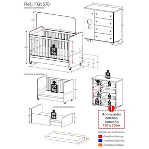 Acabamento: Pintura UV | Cor: Branco | Material: MDP/MDF | Referência do Modelo: FG3570 | Coleção: Pimpolho | Instruções de Cuidado: Limpar com pano seco para retirar o pó. Não utilizar produtos químicos ou abrasivos. Não aplicar lustra móveis. | Produto Composto por: 1 berço, 1 colchão, 1 cômoda, manual de montagem e kit ferragem. | Sistema de Montagem: O produto acompanha manual de montagem juntamente com kit ferragem. | Altura Montado: | Largura Montado: | Profundidade Montado: | Tamanho (L x A x P): 95 x 94 x 43 | Inclui Berço: Sim | Acompanha Colchão: Sim | Peso do Produto: | Inclui Gaveteiro: Sim | Inclui Guarda-Roupa: Não | Quantidade de Peças: 3 | Quantidade de Portas: | Quantidade de Gavetas: | Corrediça: Metálica | Quantidade de Puxadores: | Material do Puxador: ABS | Quantidade de Pés: | Material dos Pés: Polipropileno | Tonalidade: Branco | Produto: Conjunto de Quarto | Fabricante: Multimóveis | Portátil: Não | Requer Montagem: Sim | Registro INMETRO: 005770/2018 | RBN: 17352335011 | Regulamentado pelo INMETRO: Sim | Estado de Origem: RS | Garantia do Fabricante: 3 | Produto precisa de Montagem?: Sim, sugerimos a contratação do nosso serviço de montagem (para os CEPs em que o serviço está disponível) ou de algum experiente de sua preferência | Altura do Produto com Embalagem: | Largura do Produto com Embalagem: | Comprimento do Produto com Embalagem: | Peso do Produto com Embalagem: | Nome do Produto no Fornecedor: Quarto Infantil Berço com Colchão Incluso e Cômoda Multimóveis Pimpolho FG3570 Branco | Tempo de Garantia: 3 meses | Descrição do Tamanho: L x A x P: 95 x 94 x 43 cm | Tipo de cama: Clássica | Tamanho da cama: Berço | Quantidade de mudos: 0 | Tipo de madeira: N/A | Destaque 1: Produzido em MDP/MDF: maior durabilidade e resistência. | Destaque 2: Cômoda possui 1 porta com prateleira e cabideiro, além de 4 gavetas espaçosas. | Destaque 3: Berço 3 em 1: se transforma em sofá e minicama. | Destaque 4: Acompanha colchão. | Comprimento da cama: 79 cm | Destaque 5: Cômoda com sistema anti-tombamento. | Altura da cama: 98,5 cm | É Kit de fábrica: Sim | Largura da cama: 132,5 cm | Marca: Multimóveis | Estilo: Moderno