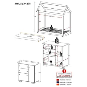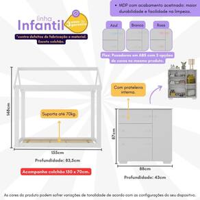Dimensões do produto montado: Cama - Altura: 148cm | Largura: 155cm | Profundidade: 83,5cm Colchão - Altura: 12cm | Largura: 150cm | Profundidade: 70cm Cômoda - Altura: 87cm | Largura: 88cm | Profundidade: 43cm *Você pode consultar as medidas detalhadas na imagem técnica do produto.