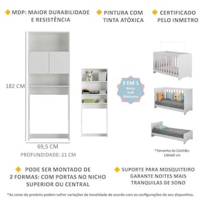 O Quarto Infantil com Berço 3x1 Nina Multimóveis é produzido em MDP, que garante maior durabilidade e resistência, possui acabamento acetinado (cerca de 20% de brilho) e o berço é 3 em 1 (se transforma em sofá e minicama). O armário com 2 portas e prateleira é ideal para espaços compactos e o design clean permite que seja utilizado em qualquer ambiente. Você ainda pode montá-lo de duas formas: com as portas no nicho superior ou central. O berço padrão nacional (tamanho do colchão 1,30 x 0,60), possui 3 regulagens de altura para o colchão e acompanha suporte para mosquiteiro, que garante noites mais tranquilas de sono para o bebê. A grade Soft (PVC) é produzida de maneira ecologicamente correta, com matéria-prima livre de metais pesados, atóxica e com proteção antiamarelamento. Berço Certificado pelo INMETRO sob o Selo n 0000085/2018. NÃO acompanha colchão.