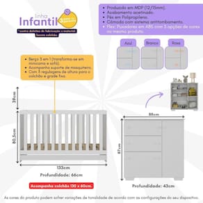 Produzido em MDP com acabamento acetinado (cerca de 20% de brilho), o Quarto Infantil com Berço Colchão Incluso e Cômoda Algodão Doce Multimóveis MP4250 oferece durabilidade, resistência e elegância. Com design versátil, o berço se transforma em minicama e sofá, proporcionando praticidade e economia a longo prazo. A grade Soft (PVC) é com matéria-prima livre de metais pesados, atóxica e com proteção antiamarelamento, enquanto o lastro em madeira maciça possui 3 regulagens de altura para o colchão. Além disso, o berço acompanha suporte para mosquiteiro e suporta até 35kg (50kg como minicama ou sofá). Acompanha colchão de espuma (D28) com tratamento antiácaro, antialérgico, antimofo e um dos lados impermeável. Berço certificado pelo INMETRO sob o selo n 0000085/2018. A cômoda (tampo e base de 15mm) possui 1 porta com dobradiças metálicas e 3 gavetas (suportam até 3kg) com corrediças metálicas, que proporcionam um manuseio suave. Com o sistema antitombamento, você terá a tranquilidade de saber que seu filho estará sempre seguro. Além disso, acompanha 3 opções de cores para os puxadores em ABS (branco, rosa e azul) e pés em polipropileno (maior estabilidade), tornando este conjunto versátil para combinar com qualquer tipo de decoração.