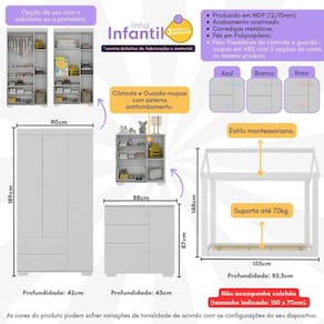 Conteúdo da Embalagem: 1 (uma) Cama Infantil Montessoriana 1 (um) Guarda-Roupas 1 (uma) Cômoda Manual de Montagem Kit Ferragem