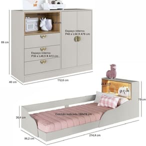 Surpreenda o seu filho com o quarto Infantil montessoriano com Iluminação LED LILLE da marca Art In Móveis. Este conjunto é composto por uma linda cama com luzes led e uma cômoda bem espaçosa. São móveis perfeitos para você organizar e até mesmo decorar seu ambiente. No quesito camas, um modelo com inovação, beleza e segurança para criançada. Este conjunto foi produzido em excelente material MDP com acabamento Finish Foil Fosco, que garante maior resistência e qualidade em seu móvel. A essência de criar soluções que trazem mais conforto à sua vida é o grande diferencial dos produtos Art In Móveis. Cada nova ideia é uma mistura de criatividade, funcionalidade e muita dedicação. Altura do Conjunto: 89 cm Ambiente Principal: Quarto Infantil codigo_ean: 7900288145307 Complexidade da Montagem: Média: pode ser montado por mais de uma pessoa e/ou necessite de maior conhecimento para montagem Cor: Arenas Cor do Produto: Arenas Escala de Brilho: Fosco Largura do Conjunto: 112,6 cm Linha ou Coleção: Lille Manual de Montagem e Instalação: https://cdn2.madeiramadeira.com.br/atributo/art-in-moveis/2917916-5225-17468795532608.pdf Marca: Art in Móveis Material Principal: MDP Medida de Cada Item: Cama: 70cm x 86,2 x 214,4 Cômoda: 89 x 112,6 x 40 modular: Não Necessita Montagem: Sim O Conjunto Contém: Cama/Cômoda Origem do Produto: Nacional Peso: Cama: 33,6kg, Cômoda: 39,2kg Pintura Atóxica: Não Porta Janelada: Não Possui Portas: Sim Quantidade de Portas: 02 Recomendações de Uso, Manutenção e Limpeza: Para a limpeza do móvel utilizar pano levemente umedecido Sistema de Montagem: Parafusos, cavilhas e minifix Suporta Até (kg): Cama: 200kg Cômoda: 55kg