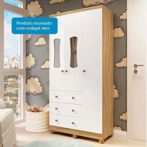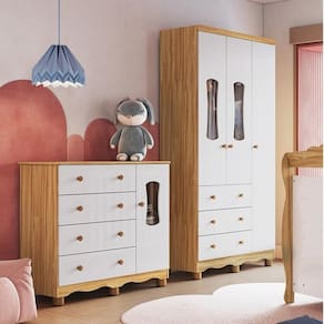 Qualidade, beleza, conforto e segurança para toda família na hora de montar o quartinho do(a) bebê. Produtos estrurados em 100% MDF e com acabamento em pintura UV atóxica proporcionando uma sensação agradável ao toque. As gavetas deslizam suavemente por corrediças telescópicas, facilitando sua abertura, interno com prateleiras que são ideais para acomodar as peças com organização da sua preferência. Essa proposta é a queridinha do momento. Ambiente composto por: - 1 Guarda Roupas 3 Portas com Janelas 188,50 x 91,90 x 41,50 (A x L x P - cm) - 1 Cômoda 1 Porta 4 Gavetas 88 x 95,30 x 42,30 (A x L x P - cm)