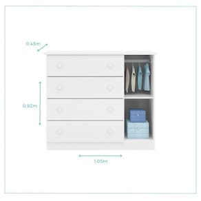 Este lindo Dormitório Lívia vai encantar ainda mais o seu ambiente. Projetado para acompanhar todo o desenvolvimento infantil, dispõe de um Roupeiro com 04 Portas e 02 Gavetas além de uma Cômoda com 01 Porta e 04 Gavetas. Produzido 100% em MDF e pintura UV Alto Brilho atóxica proporcionando mais qualidade e durabilidade ao produto. As Corrediças Telescópicas promovem um deslizamento suave, silencioso e muito mais resistente. Há também cabideiros inclusos que favorecem a organização e otimizam o espaço. É sem dúvidas o Conjunto Perfeito para compor o ambiente mais importante do seu bebê com conforto, segurança e delicadeza. Altura do Conjunto: 203 cm Ambiente Principal: Quarto Infantil Complexidade da Montagem: Média: pode ser montado por mais de uma pessoa e/ou necessite de maior conhecimento para montagem Cor: Branco Cor do Produto: Branco Escala de Brilho: Brilhante Manual de Especificação Técnica: https://cdn2.madeiramadeira.com.br/atributo/phoenix-baby/1279277-gr-livia-4pta.pdf Manual de Montagem e Instalação: https://cdn2.madeiramadeira.com.br/atributo/phoenix-baby/1279279-gr-livia-4pta.pdf Material Principal: MDF Medida de Cada Item: Guarda Roupa: 203cm x 147cm x 45cm Cômoda: 92cm x 105cm x 45cm Necessita Montagem: Sim Origem do Produto: Nacional Peso: 133.7 Pintura Atóxica: Sim Recomendações de Uso, Manutenção e Limpeza: Pano seco. Sistema de Montagem: Parafusos Suporta Até (kg): 75
